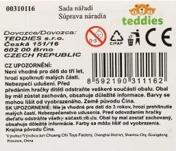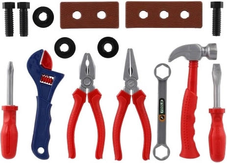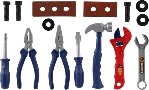 Súčasťou sady sú typické nástroje ako kladivo, skrutkovač, kliešte či kľúč, rovnako aj matice a skrutky na nácvik skrutkovania. Vďaka praktickému sáčku je upratovanie aj prenášanie hračka – skvelé aj ako darček.