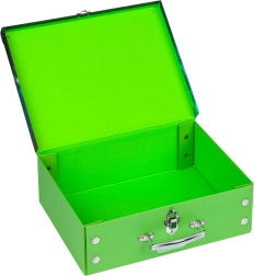 Kufrík je vyrobený z laminovaného papiera a vybavený kovovými rohmi pre odolnosť proti opotrebeniu.