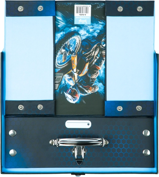 Skladací školský kufrík s motocrossovým motívom je vyrobený z kvalitného laminovaného papiera s kovanými rohmi pre zvýšenú odolnosť. Ponúka praktickú možnosť zloženia a rozloženia vďaka patentkám, čo uľahčuje skladovanie aj prepravu. Kovové ucho a klasická pracka zabezpečujú ľahkú manipuláciu a bezpečné uzavretie obsahu.