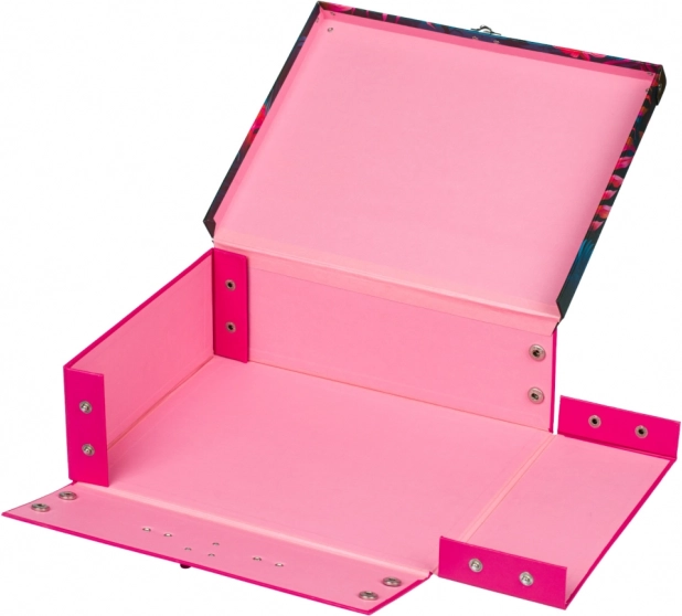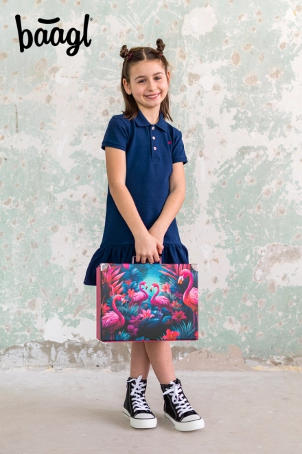 Štýlový skladací kufrík s výrazným motívom plameniakov a tropickej flóry pre školákov. Ozdobený kovaním pre vyššiu odolnosť a elegantný vzhľad.