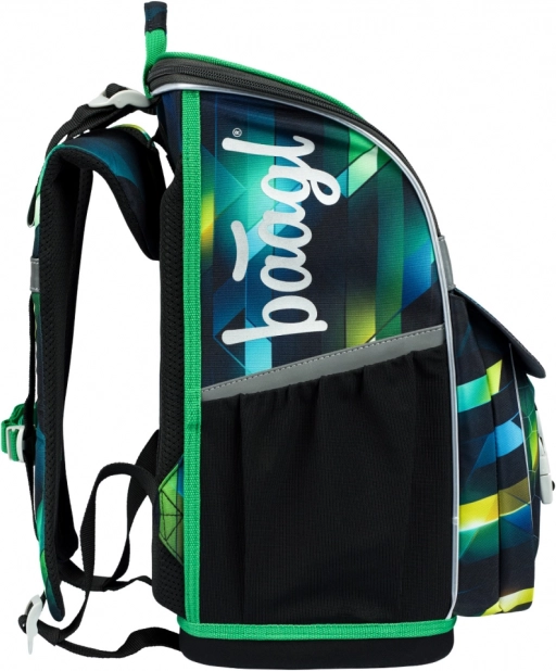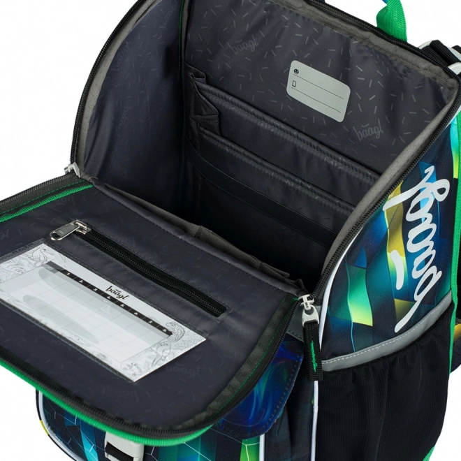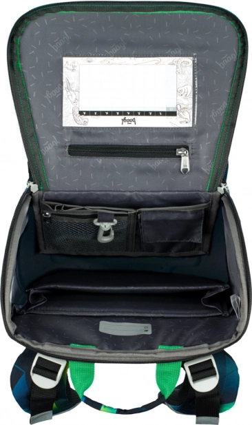 Premyslené vnútorné usporiadanie zahŕňa vyklápací systém otvárania pre ľahký prístup priamo z lavice, priehľadné vrecko na rozvrh, vnútorný organizér s gumičkou a izolované predné vrecko na desiatu. Bočné vrecká z pevného materiálu pojmú fľašu na pitie, zatiaľ čo pevné dno zabezpečuje, že aktovka samostatne stojí.