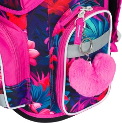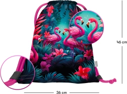 Aktovku dopĺňa jednoposchodový peračník bez náplne a pevné vrecko s karabínkou na pripnutie k aktovke. Všetko v hravom tropickom motíve plameniakov.