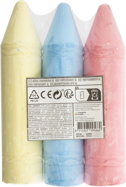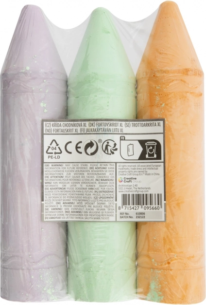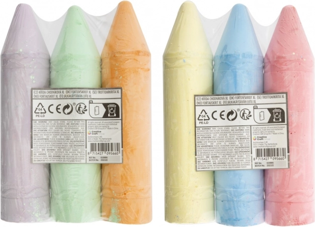 Obohaťte svoje kresliace aktivity s týmito farebnými kriedami XL, ktoré sú dostupné v dvoch variantách - žltá, modrá a ružová alebo oranžová, zelená a fialová. Každá sada obsahuje tri kriedy, ktoré majú optimálnu dĺžku 19 cm, čo uľahčuje držanie pri kreslení.