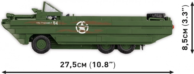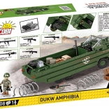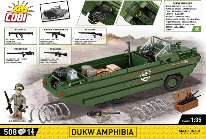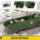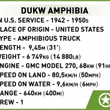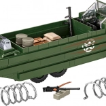 Stavebnica Amfíbií DUKW je navrhnutá pre milovníkov histórie a vojenskej techniky. Model je vyrobený v meradle 1:35 a zdobia ho oficiálne logo osláv 80. výročia vylodenia Spojencov v Normandii. Prináša realistické prvky, ako sú otočné kolesá a americký vojak s množstvom príslušenstva, vrátane bazuky, pušky Browning, Garand, Thomson a M1. V nákladnom priestore nájdete debny, sudy, kanistry a náhradné koleso.