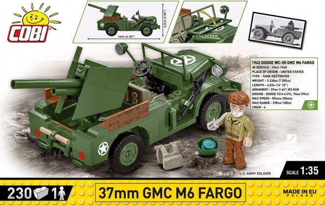 37 mm GMC M6 Fargo je americké ľahké obrnené vozidlo používané počas druhej svetovej vojny. Vyvinuté na podvozku nákladného auta Dodge WC, bolo vybavené 37 mm protitankovým kanónom M3, čo ho činilo efektívnym v boji proti ľahkým obrneným vozidlám a opevneníam. Tento stavebnicový model od značky COBI je vyrobený v mierke 1:35 a skladá sa z 230 dielikov.