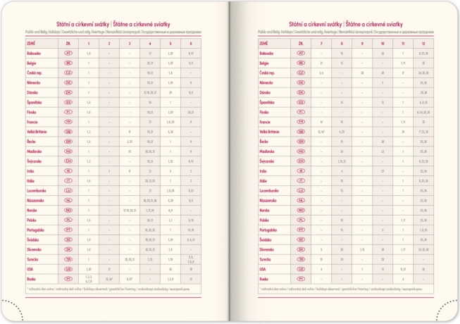 - Obsahuje sviatky Českej a Slovenskej republiky aj medzinárodné sviatky.