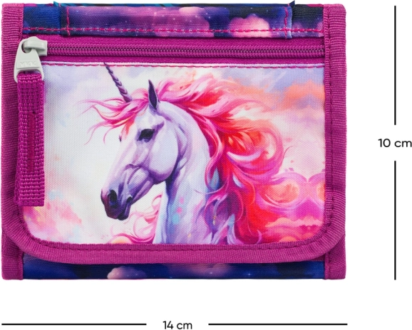 Vnútorné usporiadanie je navrhnuté na prehľadné uloženie bankoviek, kariet a preukazov, nechýba samostatné zipsové vrecko na mince. Suchý zips drží obsah spoľahlivo uzavretý. Farebné prevedenie s jednorožcom a hviezdnym motívom zaujme na prvý pohľad a skvele ladí s ďalšími doplnkami.