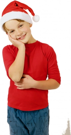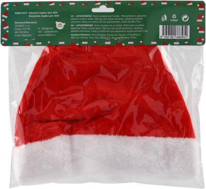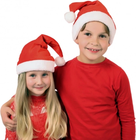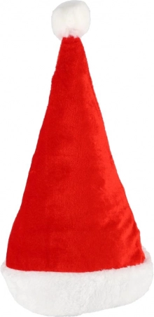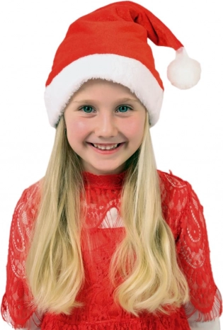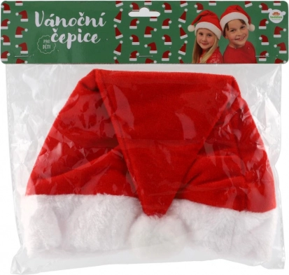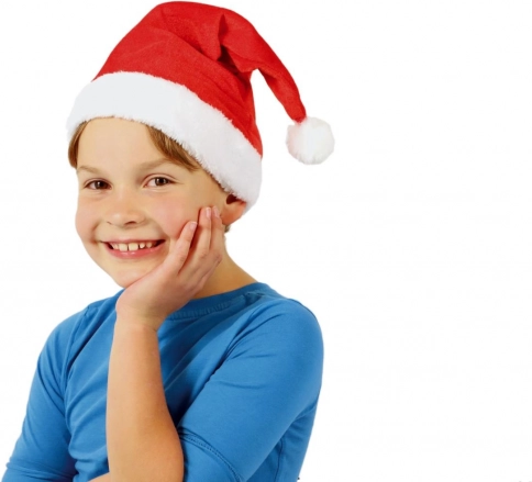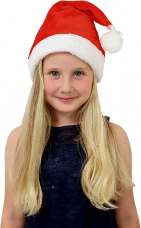 Detská vianočná čiapka Santa z mäkkej látky, priemer 25 cm. Pohodlný a štýlový doplnok na oslavy, besiedky aj fotenie. Klasický vzhľad s bambuľkou.