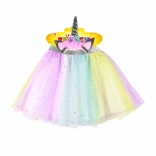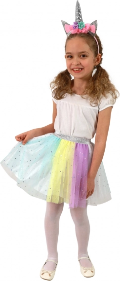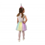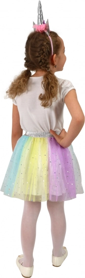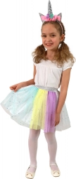 Táto pôvabná sada prináša kúzlo jednorožcov do detského šatníka. Ľahká a vzdušná tutu sukňa v pastelových farbách sa krásne točí a vďaka pružnému pásu sa ľahko oblieka a príjemne nosí. Štýl dopĺňa čelenka s rohom a kvetinovou ozdobou, ktorá z obyčajného dňa urobí rozprávkové dobrodružstvo.