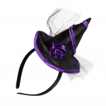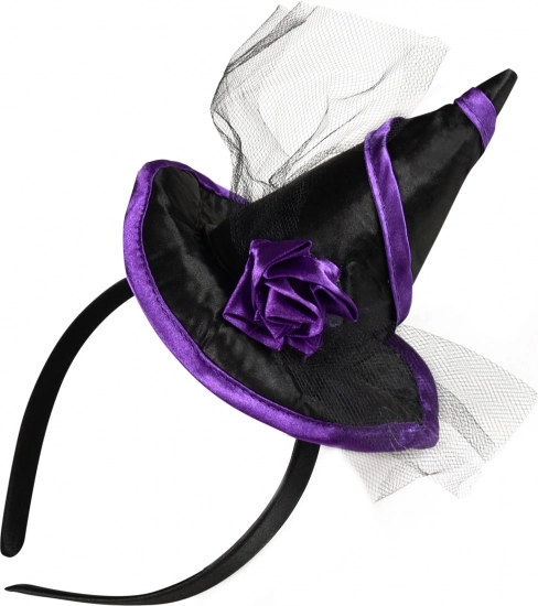 Štýlová čarodejnícka čelenka je perfektný doplnok na večierok, karneval aj Halloween. Kombinuje čierno‑fialové prevedenie, saténový mini klobúčik a tylovú kvetinovú ozdobu pre výrazný a fotogenický look.