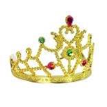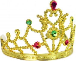 Zlatá tiara je posiata rôznofarebnými kameňmi, medzi ktorými vynikajú zelený a červený. Táto tiara dodáva každému outfitu nádych kráľovského vzhľadu.
