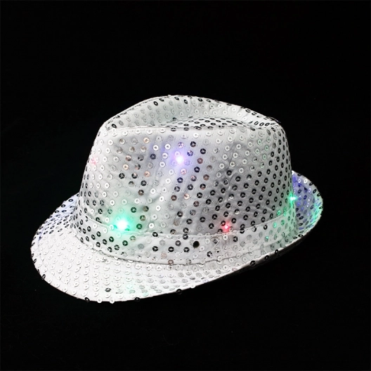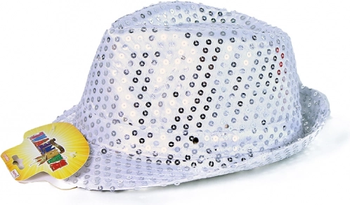 Rozbehnite každú párty s týmto štýlovým strieborným disco klobúkom! Flitrový povrch a farebne blikajúce LED osvetlenie s tromi režimami z neho robia neprehliadnuteľný doplnok. Ovládanie je jednoduché vďaka nenápadnému tlačidlu na boku a súčasťou balenia sú 3 batérie LR44.