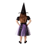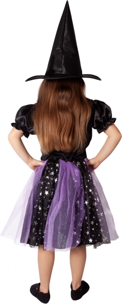 Tento pôvabný kostým čarodejnice poteší všetky malé milovníčky kúziel. Kombinuje elegantnú čiernu s čarovnou fialovou, trblietavé hviezdy a ľahký tyl pre skutočne magický vzhľad. Špicatý klobúk ladí so šatami a dotvára kompletný outfit na karneval, Halloween alebo školské besiedky.
