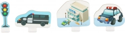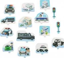 Táto jedinečná skladačka ponúkne vašim deťom možnosť postaviť si vlastné policajné mesto. 38 puzzlí umožní vytvoriť vlastnú sieť kľukatých ulíc, po ktorých sa môžu deti preháňať s policajnými autami a dohliadať na poriadok. Sada obsahuje aj špeciálne diely, ktoré sa dajú voľne rozmiestniť na základne a tvoriť tak nové infraštruktúrne prvky.