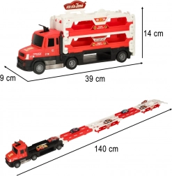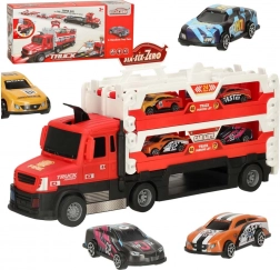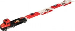Ťahač s autami a rozkladacou pretekárskou dráhou, 6 áut, červený