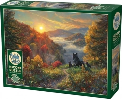 Scéna východu slnka v lese s medveďmi a žiarivými farbami jesene premení hotové puzzle na nádhernú dekoráciu.