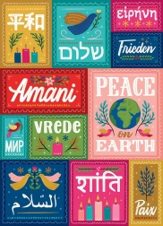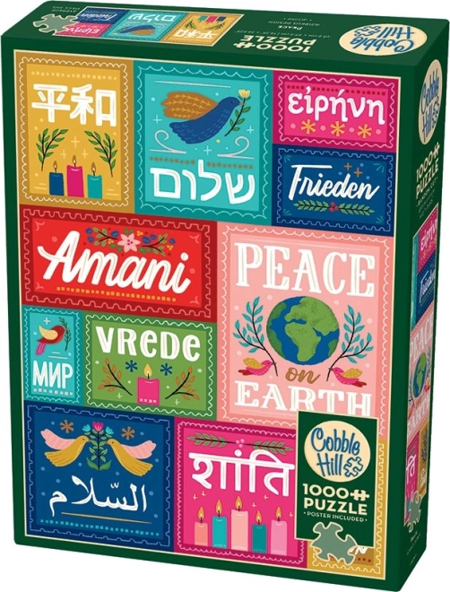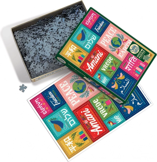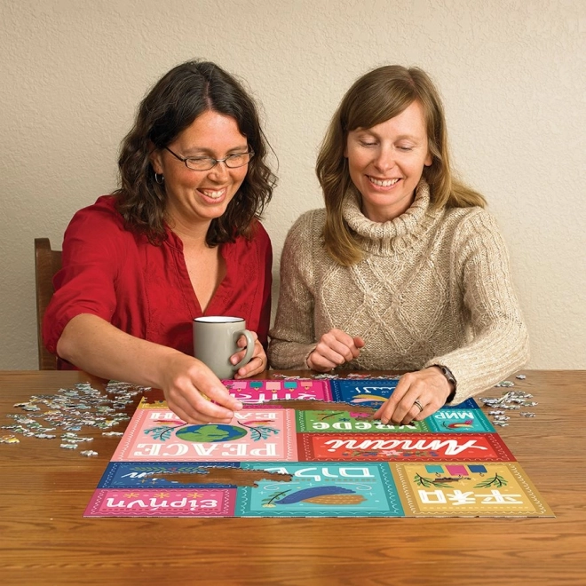 Toto dizajnové puzzle prináša silné posolstvo – mier je univerzálny. Horný rad predstavuje japončinu, hebrejčinu, gréčtinu a nemčinu, uprostred nájdete svahilčinu (červená), ruštinu, ukrajinčinu a ďalšie slovanské jazyky používajúce cyriliku (tyrkysová), afrikánčinu, holandčinu (zelená) a angličtinu. Spodný rad dopĺňa arabčinu, hindčinu a francúzštinu.