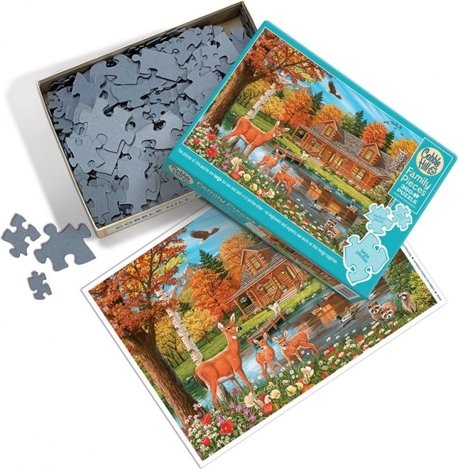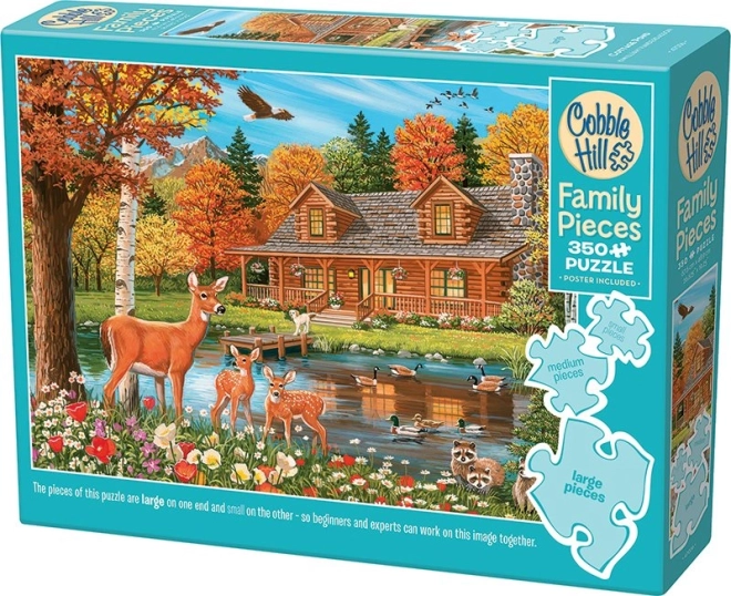 Rodinné puzzle COBBLE HILL je navrhnuté tak, aby si skladanie užili všetci – od najmenších po dospelých. Motív idylického rybníka pri chalúpke prináša pokojnú atmosféru a krásne detaily, ktoré vás budú baviť objavovať. Rozdelenie puzzle do zón s odlišnou veľkosťou dielikov umožňuje pohodlné skladanie vedľa seba.