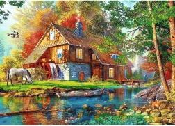 Objavte čaro vidieka s puzzle, ktoré po zložení vytvorí obraz s rozmermi 480 × 340 mm. Ilustrácia Dominica Davisona zachytáva idylickú chalupu pri pokojnej riečke, obklopenú prírodou – ideálny motív pre chvíle oddychu a sústredenia.