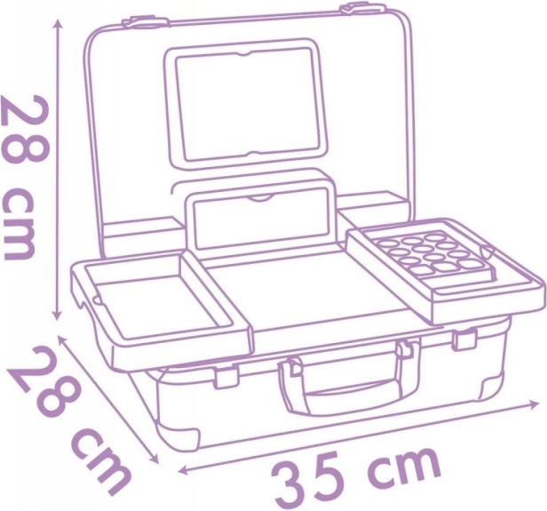 Kufrík je vybavený praktickým zrkadlom, poličkami, priehradkami a tajnou priehradkou pre bezpečné uloženie obľúbených vecí. Vďaka kompaktnému dizajnu je ľahko prenosný, čo umožňuje hru na kaderníctvo a líčenie kdekoľvek.