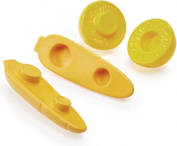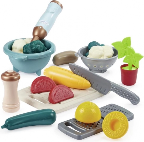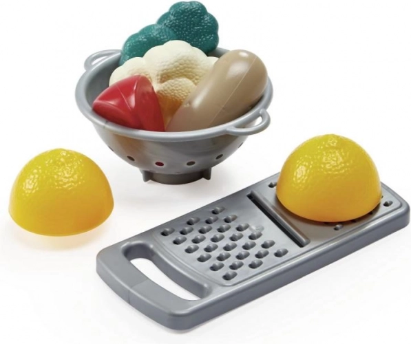 Miska, cedidlo, doska na krájanie, nôž, strúhadlo a makety zeleniny umožnia deťom krájať, strúhať aj miešať ako v skutočnej kuchyni.