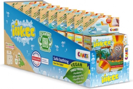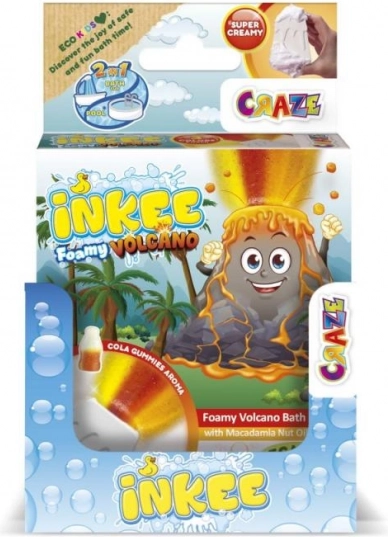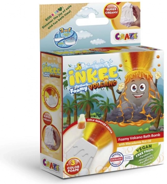 INKEE Foamy Volcano je veľká 110 g šumivá bomba do vane v tvare sopky, ktorá po vhodení do vody vyšľahne prúd žltej, červenej a oranžovej a vytvorí tak úžasný efekt erupcie. Pri rozpúšťaní zanechá vodu krásne oranžovú a naplní kúpeľňu kombináciou vône jahody a cola gummies.