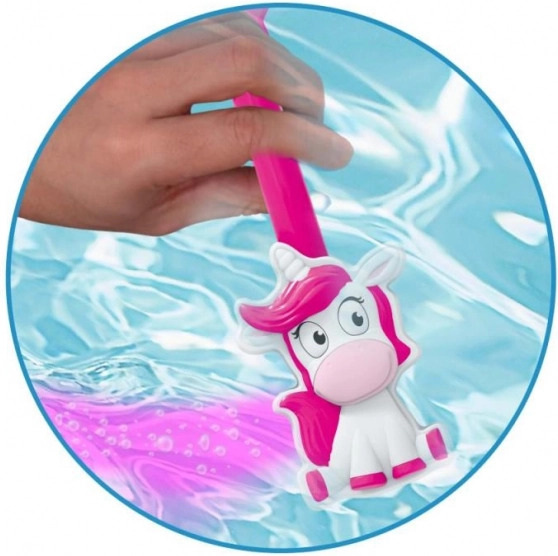 Vložte šumivú kvapku do jednorožca a ponorte paličku do vody – z paličky sa vykúzli jasná farebná stopa, ktorá premení kúpeľ na čarovný zážitok.