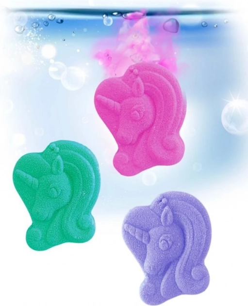 Každá tableta sa po vhodení do vody začne šumivo rozpúšťať a prevonia kúpeľ karamelovou tortou. Tri rôzne farby – ružová, fialová a modrozelená – dodajú každému kúpeľu inú atmosféru. Vhodné pre deti, ktoré milujú jednorožce a hravé farby.