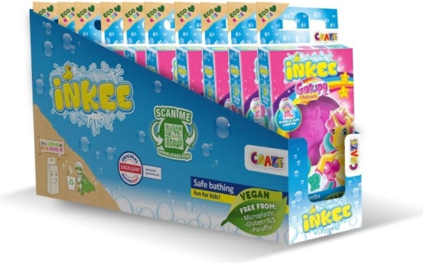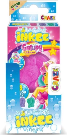 Doprajte deťom čarovný kúpeľ so šumivými bombami Inkee Jednorožec Galupy. V balení nájdete 3 mini bomby v tvare podkovy v ružovej, fialovej a modrozelenej farbe s lahodnou vôňou karamelovej torty. Ideálne pre hravú, voňavú a bezpečnú relaxáciu vo vani.