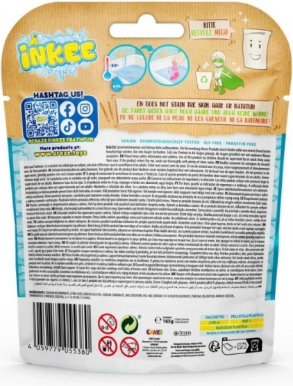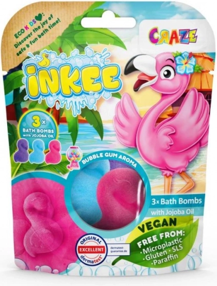 Spríjemnite deťom aj sebe kúpeľ hravými šumivými bombami INKEE v tvare plameniaka. V balení nájdete tri farebné bomby (ružová, fialová, modrá) s vôňou žuvačky a ošetrujúcim jojobovým olejom. Zloženie je vegan, bez mikroplastov, gluténu, SLS a parafínu a je navrhnuté tak, aby nekontrolovane nefarbilo vaňu. Skvelé pre zábavný, voňavý a šetrný kúpeľ.