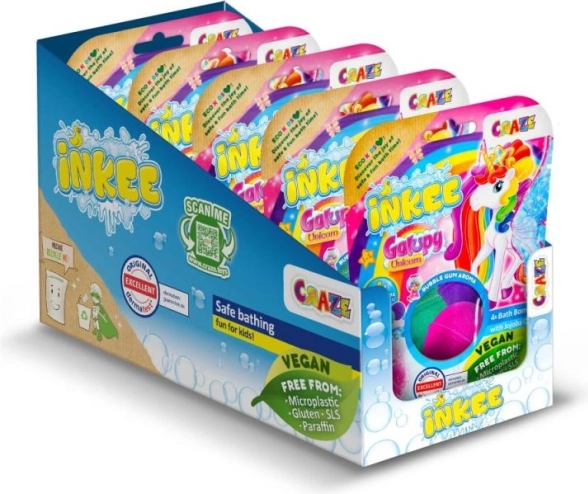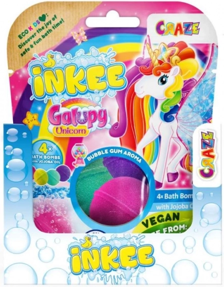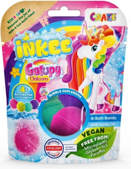 Prineste do detského kúpeľa radosť a farby s INKEE Galupy Unicorn. Každá bomba vo vode jemne šumí, uvoľňuje zábavné farby a sladkú vôňu žuvačky, zatiaľ čo jojobový olej pomáha udržať pokožku hebkú.