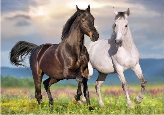 Objavte radosť zo skladania s pôsobivým motívom dvoch koní v behu. Tento obraz zaujme realistickými detailmi a živými farbami, ktoré po dokončení vyniknú ako dekorácia. Vďaka premyslenej náročnosti je skladačka skvelá pre začiatočníkov aj pokročilých.