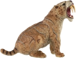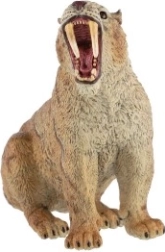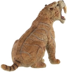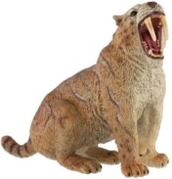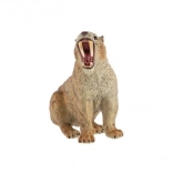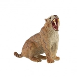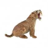 Otvorená tlama a dlhé tesáky podčiarkujú charakter pravekého lovca. Textúrovaná srsť a prirodzené sfarbenie dodávajú figúrke verný vzhľad.
