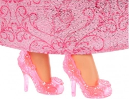 Bábika je oblečená do ružových šiat s trblietavými detailmi a ozdobou, ktoré napodobňujú filmovú podobu Aurory.