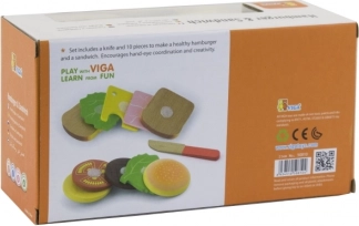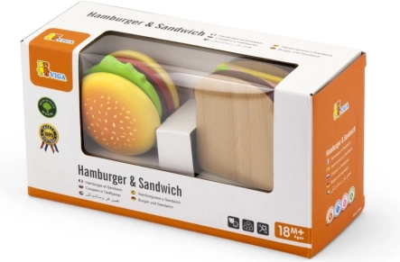 Táto VIGA drevená sada hamburgeru a sendviča je ideálna pre malé deti, ktoré rady napodobňujú dospelých pri varení. Farebné a bezpečné drevené komponenty, ako sú žemle, šalát, paradajky a syr, umožňujú neobmedzenú hru a kreativitu. Hračka pomáha v rozvoji: