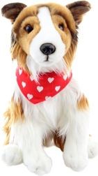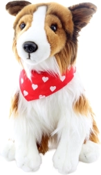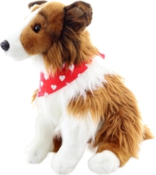 Táto plyšová hračka v tvare psa dlhosrstej kólie je pokrytá mäkkým hnedo-bielym kožúškom a je ideálna pre deti od 0 rokov. Je vybavená červenou šatkou s bielymi srdiečkami, čo pridáva na jej čare.