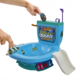 HOT WHEELS Skate Flush & Go je zábavný prstový skatepark, ktorý premení „záchodovú misu“ na perfektný bowl na triky. Stlačením páčky vypustíte dosku priamo do víru jazdy a nadviažete na skoky z rámp, prechádzanie po zábradlí aj dropy zo zadnej rampy. Ideálne na tréning zručností a nekonečné herné scenáre.