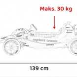 Malí pretekári sa môžu tešiť na mäkké EVA kolesá (21×10 cm) pre tichú a komfortnú jazdu, ergonomické sedadlo z ekokože s pásmi a efektné LED svetlá vpredu aj vzadu. Integrovaný audio panel s Bluetooth, USB, AUX a MP3 prehrávaním doplní atmosféru obľúbenými melódiami; na volante sú k dispozícii tlačidlá s klaksónom a zvukmi.