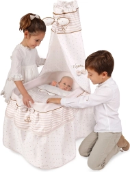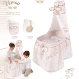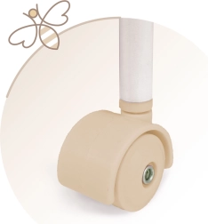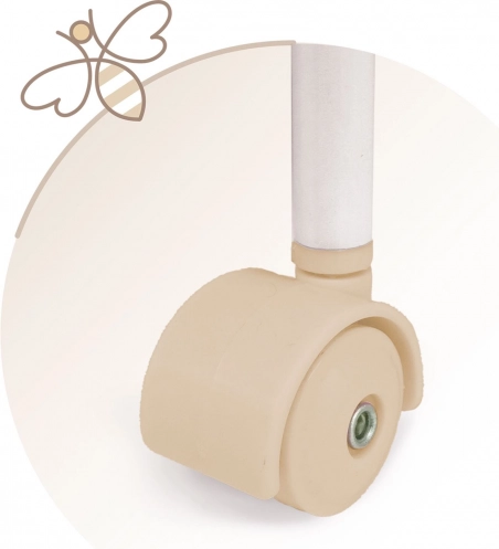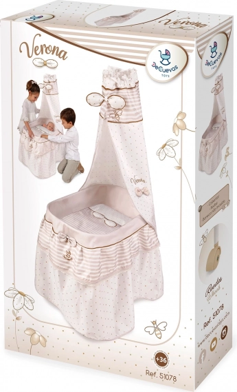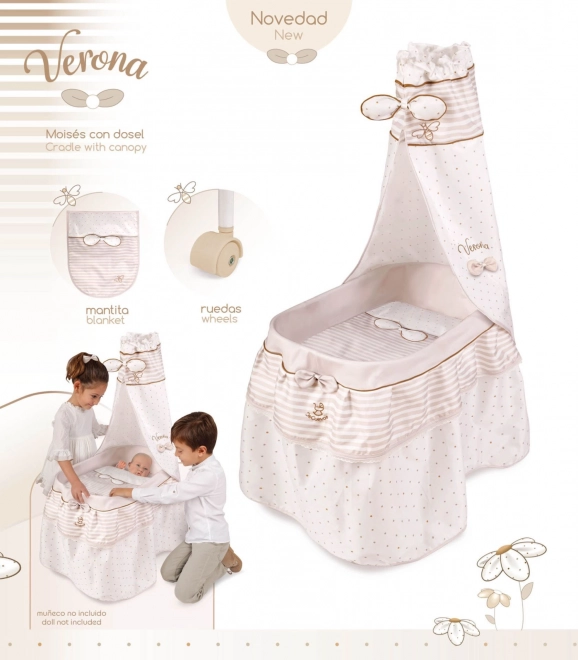 Táto štýlová postieľka pre bábiky je ladená do jemných pastelových tónov béžovej a bielej s decentnými bodkami a prúžkami. Prírodný vzhľad dopĺňajú mašličky pripomínajúce okvetné lístky a drobné výšivky včielok, ktoré podčiarkujú šarm celej kolekcie VERONA. Vďaka otočným kolieskam možno postieľku ľahko presúvať z izby do izby, aby mala malá opatrovateľka svoje bábätko vždy pri sebe.