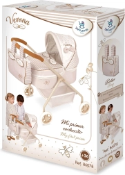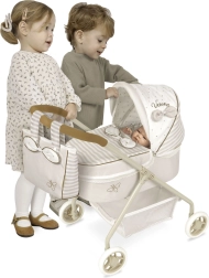 Objavte pôvabný kočík pre bábiky v jemnej kombinácii béžovej a bielej s bodkami a prúžkami. Kvalitné spracovanie a španielsky dizajn zabezpečujú dlhú životnosť, zatiaľ čo nízka rukoväť a nízka hmotnosť uľahčujú ovládanie aj tým najmenším deťom. Štýl dotvárajú dekoratívne mašličky a jemné výšivky.