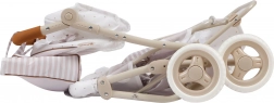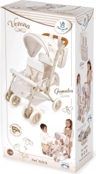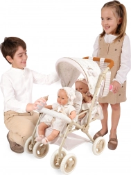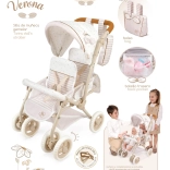 Objavte čaro kolekcie Verona v jemných prírodných tónoch a vzoroch. Ľahko béžové a biele textílie s bodkami a prúžkami dopĺňa elegantné lemovanie a detaily v podobe mašličiek a výšiviek včielok. Kočík pre dvojičky je navrhnutý na pohodlné vozenie dvoch bábik naraz a zaujme precíznym spracovaním a španielskym dizajnom.