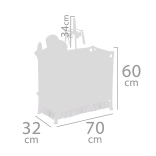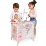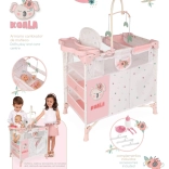 Set obsahuje všetko na kompletnú starostlivosť: postieľku s priehľadným sieťovaným okienkom, kolotoč s lístočkami, prebaľovací pultík, jedálenskú stoličku s plastovým setom (fľaša, miska, príbor) a veľkú šatňu na zips s tyčou a 3 ramienkami. Vďaka skladnému prevedeniu sa s celou zostavou ľahko manipuluje a po hre ju rýchlo upracete.