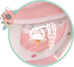 Praktické doplnky uľahčia hranie – odnímateľná taška sa dá nosiť aj ako ľadvinka, kryt vaničky sa ľahko pripevní pomocou očiek a bočné vrecko pojme drobnosti. Jednoduchá manipulácia a precízne spracovanie zaistia dlhú životnosť a radosť z každej prechádzky s bábikou.