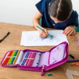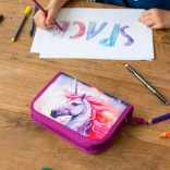 Prednú stranu zdobí detailný motív jednorožca v ružovo‑fialových tónoch, ktorý z peračníka robí neprehliadnuteľný doplnok do školy.
