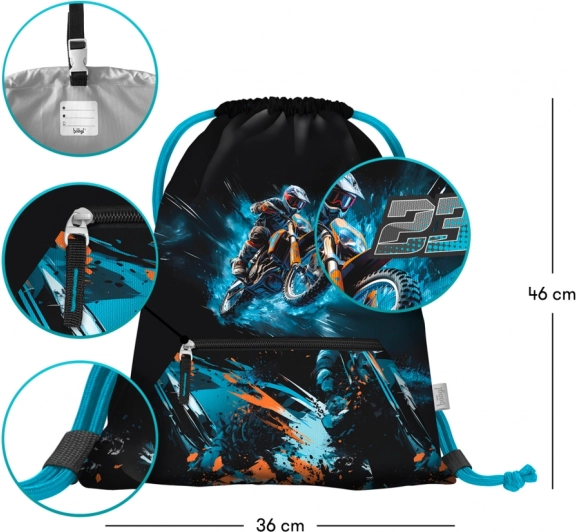Vrecko BAAGL Motorka kombinuje štýlový športový dizajn s maximálnou funkčnosťou. Je vyrobené z pevného, ľahko umývateľného materiálu, ktorý odolá každodennému používaniu pri tréningu, v škole aj na cestách. Sťahovacie šnúrky slúžia zároveň ako ramenné popruhy, takže vrecko pohodlne unesiete na chrbte.