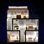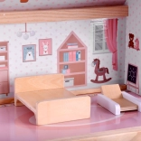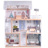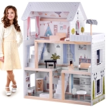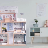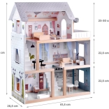 Tento drevený domček pre bábiky je navrhnutý tak, aby deti inšpiroval k tvorivej hre a rozprávaniu príbehov. Ponúka prízemie s kuchyňou a kúpeľňou, prvé poschodie s obývacou izbou a čitárňou s kútikom pre milovníkov hudby a podkrovie s roztomilou detskou izbičkou a veľkou terasou. Jemná boho estetika, ilustrácie a drevené prvky pôsobia upokojujúcim dojmom.