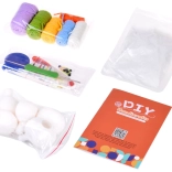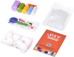 - 6× klbko priadze (ecru, modrá, žltá, zelená, fialová, oranžová); 5× gumový balónik na výplň; výplň (vata); háčik 2,5 mm; bezpečné nožnice; 2× bezpečná ihla; samolepiace očká; 10× zatvárací špendlík/markér; zvinovací meter; tyčinkové tavné lepidlo; ilustrovaný návod (EN)