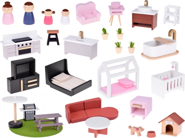 Domček obsahuje všetky potrebné príslušenstvá pre kompletné vybavenie všetkých miestností.