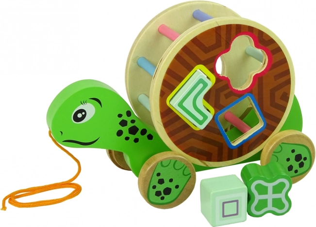 Hračka je vyrobená z odolného dreva, všetky hrany sú hladko brúsené a farby sú netoxické. Bubienok možno z chrbta zložiť, takže dieťa získa dve varianty hry: ťahaciu korytnačku a samostatný sortér.