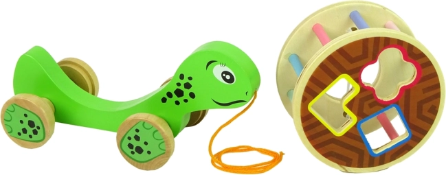 Drevená ťahacia korytnačka so sortérom je múdra hračka pre najmenších, ktorá spája pohyb, rozvoj jemnej motoriky a učenie tvarov. Farebný otočný bubienok so sortérom a 3 kockami trénuje logiku a koordináciu ruka–oko, zatiaľ čo šnúrka a kolieska lákajú k aktívnej hre. Vyrobené z kvalitného dreva a bezpečne lakované.